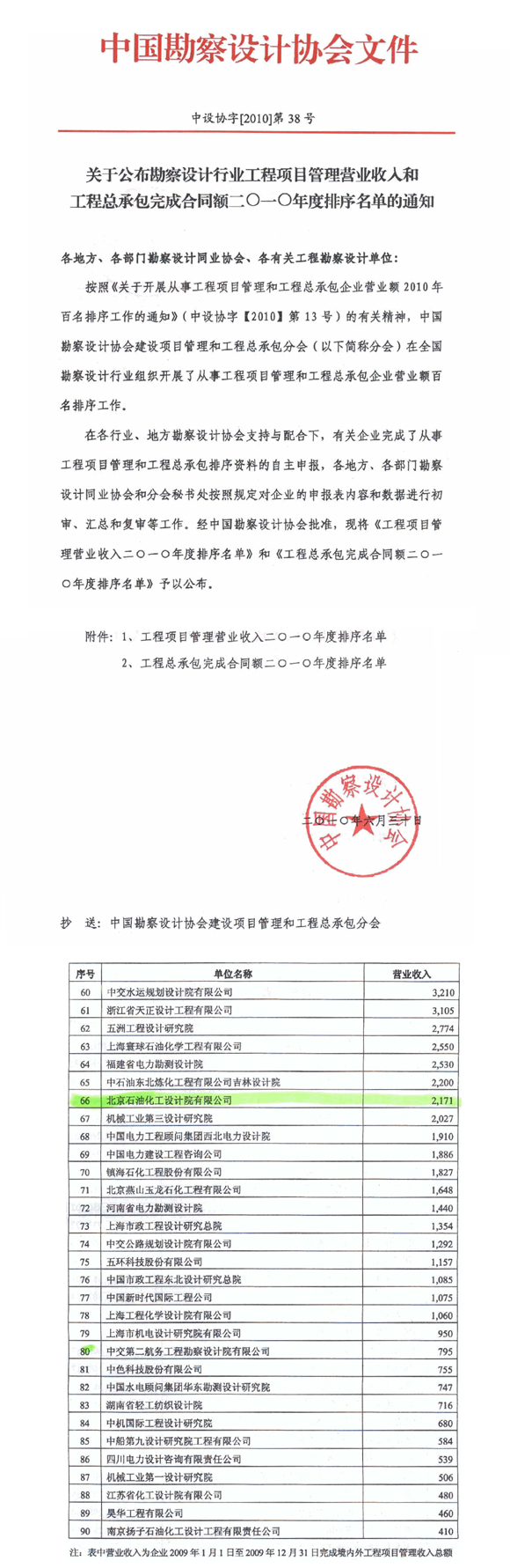 在中國勘察設(shè)計協(xié)會(中設(shè)協(xié)字[2010]第38號)近日公布的“勘察設(shè)計行業(yè)工程項目管理營業(yè)額收入二〇一〇年度排序名單”中,我院喜獲排名第66位,這是繼二〇〇八、二〇〇九年之后,我院連續(xù)第三次躋身全國百名排序名單之中。
